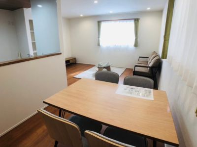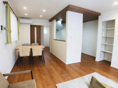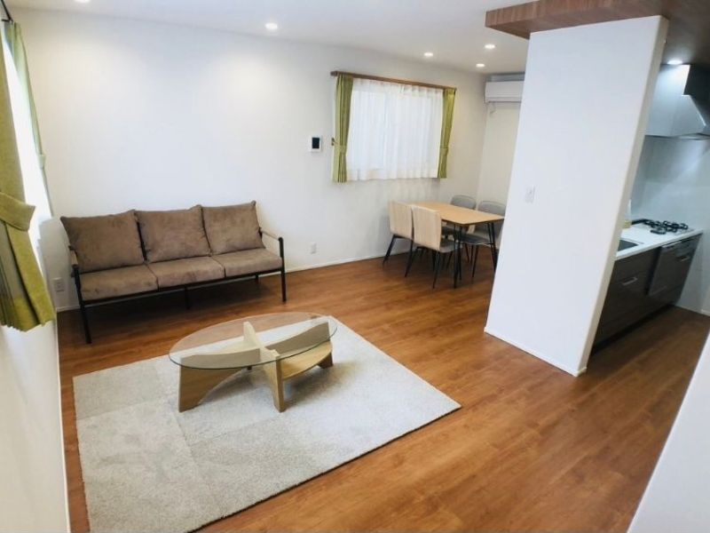 木目調の床と白を基調とした壁が、明るく心地よい空間を演出するLDK。 リビング・ダイニング・キッチンがひとつにつながった開放的なレイアウトは、家族の会話が自然と生まれる設計。 窓際のグリーンのカーテンがやさしいアクセントとなり、ナチュラルなインテリアとも好相性。 コンパクトながらも機能的なキッチンは、毎日の料理も快適に。 暮らしやすさとデザイン性を両立した、心地よい住まいです。