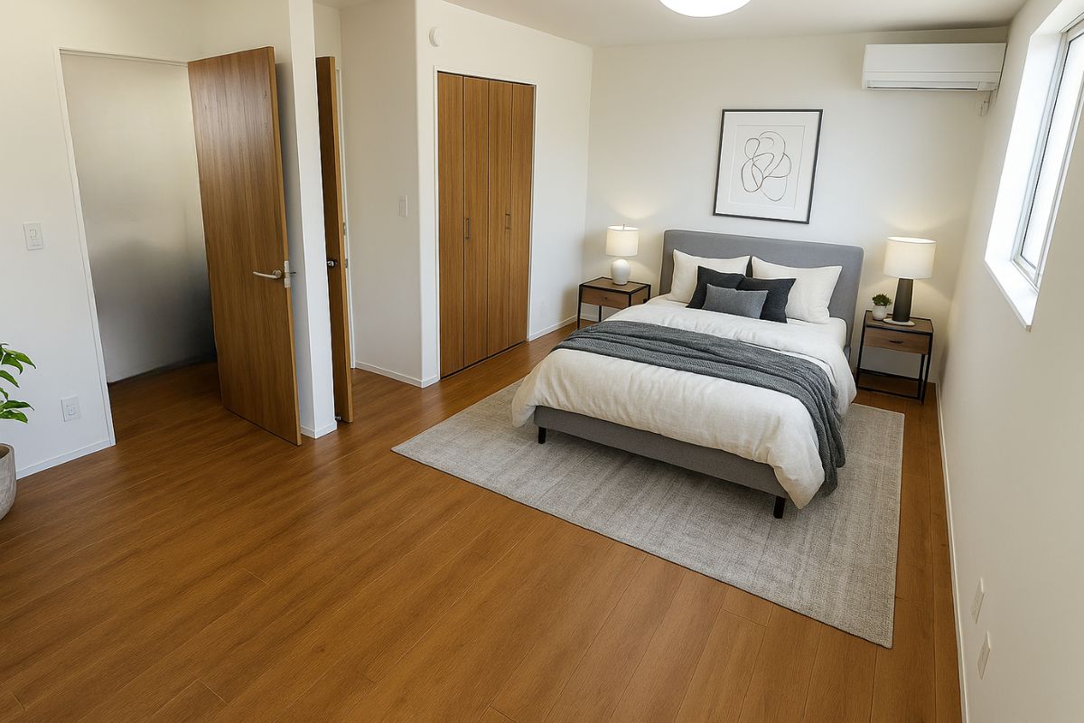 白壁と木目の床がやさしく調和する、明るく清潔感のある洋室。 窓から差し込む自然光が空間をやわらかく包み込み、心地よい時間が流れる。 収納力のあるクローゼットが2か所に設けられ、衣類や日用品もすっきり整理可能。 エアコン完備で季節を問わず快適に過ごせる、寝室にも書斎にも使える柔軟な一室です。