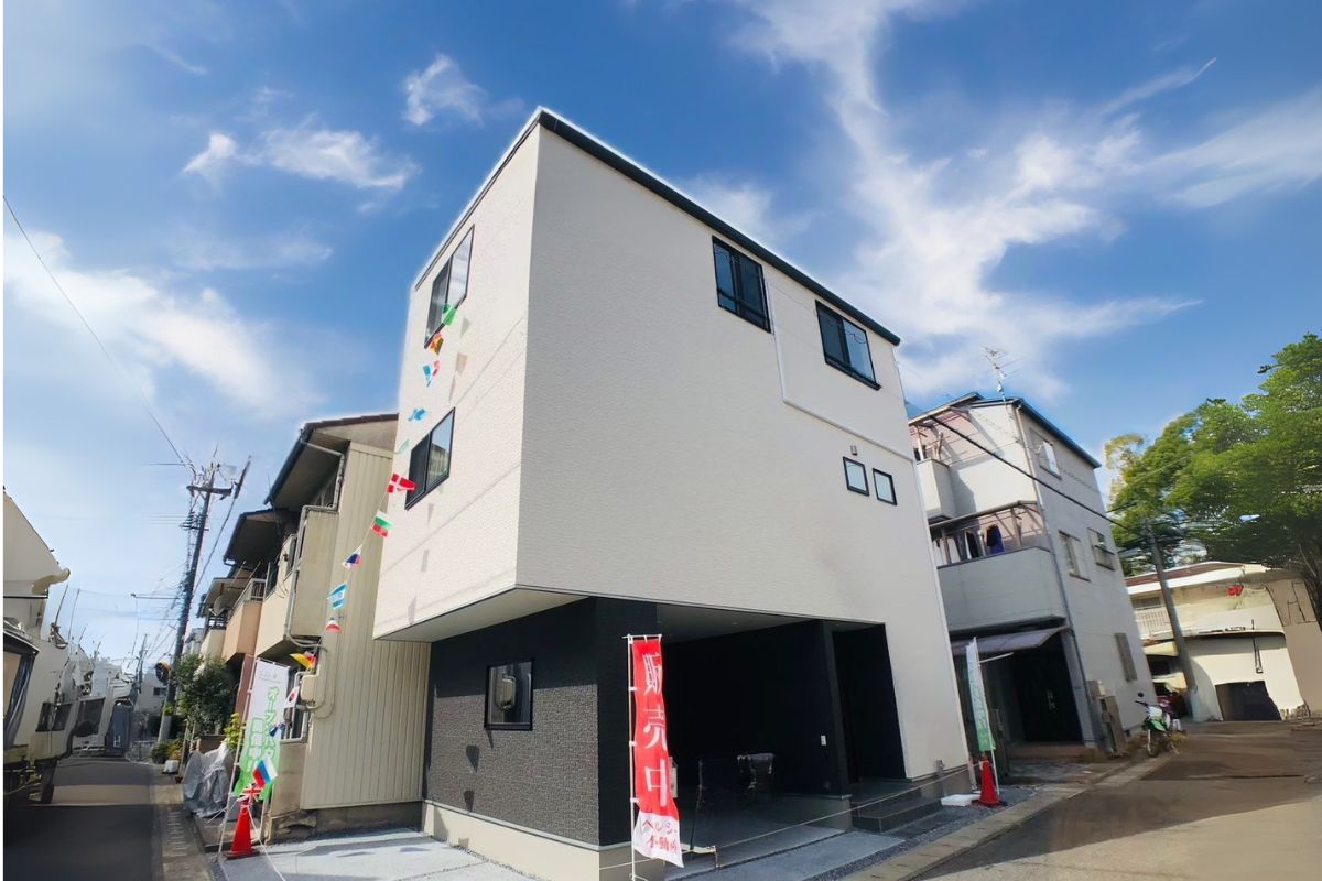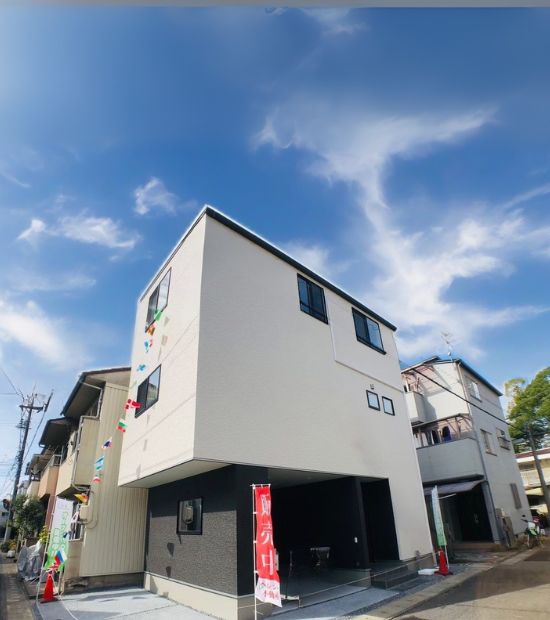 ホワイト×ダークグレーの外壁がスタイリッシュな印象を与える、車庫付き3階建て住宅。 縦に伸びるフォルムが都会的で、限られた敷地でも広々とした空間を確保。 雨の日も安心なビルトインガレージは、荷物の出し入れやお子さまの乗り降りにも便利。 シンプルながらも洗練された外観は、街並みに映える存在感を放っています。