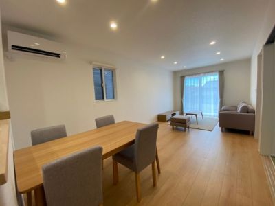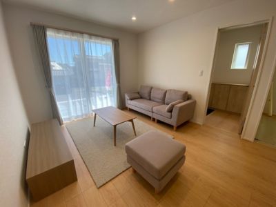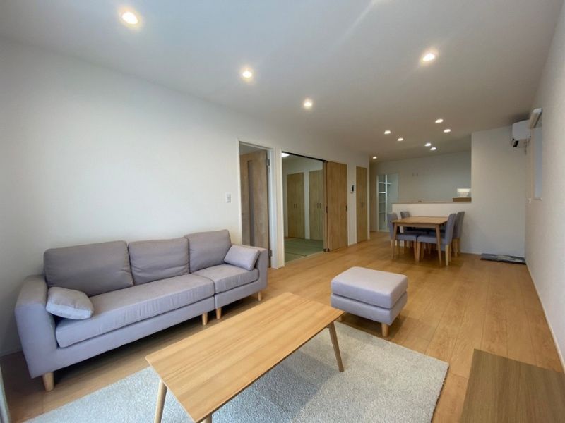 明るい木目と白を基調にした空間に、グレーのソファや木製家具がやさしく馴染む、開放感あふれるLDK。奥には引き戸でつながる和室があり、現代的なデザインの中に日本らしい落ち着きも感じられます。家族が自然と集まりたくなる、穏やかなひとときを育む住まいです。