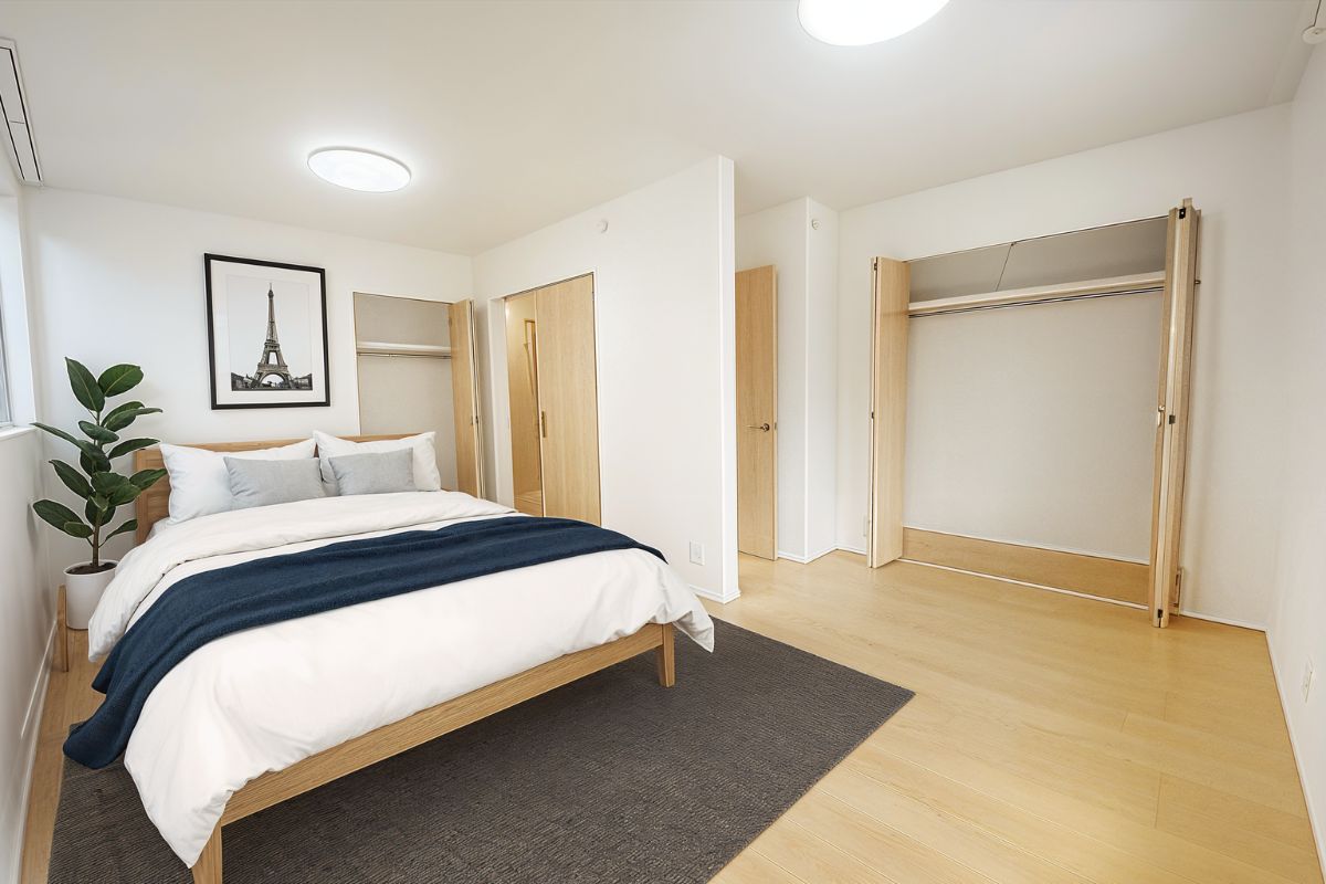 白と木目を基調にした空間に、ネイビーのファブリックとグリーンの観葉植物が彩りを添える、落ち着きのある寝室。壁に飾られたアートがさりげない個性を演出し、すっきりとした収納と広々とした床面が、快適な暮らしを支えます。自然体で過ごせる、穏やかなひとときを育む空間です。